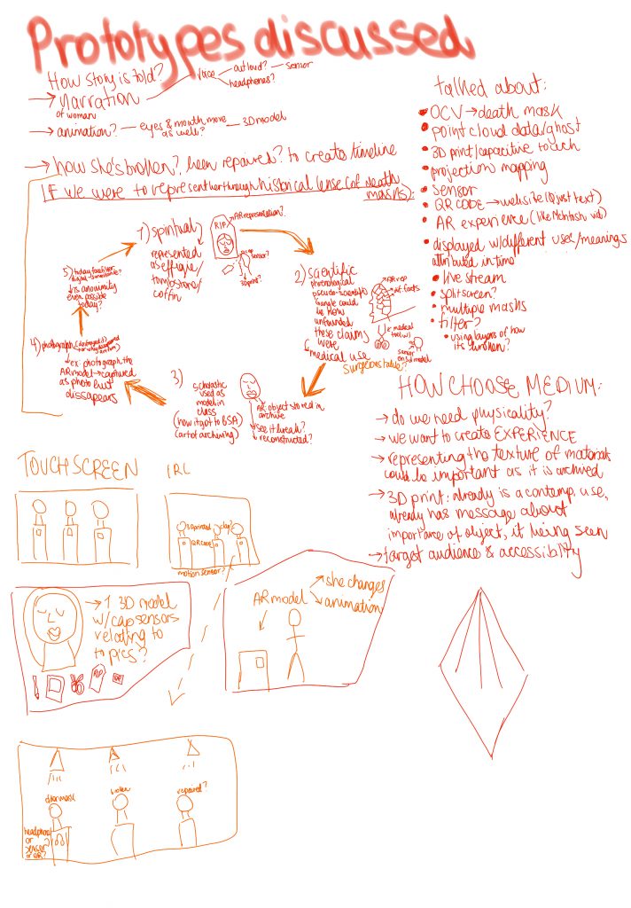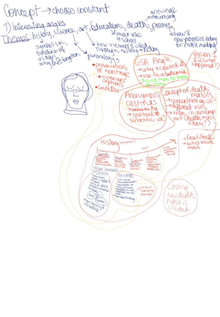 We decided to learn about the piece individually, and reconvene to talk about what interested us. Our first meetings were just dissecting the piece, and the history of the practice of making death masks. We were left with so many avenues of research, and weren’t sure where to go from there. We met with Pavel, the TA, to help us define what roles we should have. I chose to be involved with the production, as its something I enjoy doing, as a filmmaker who produces their own films, and as it could be easily delegated between the other students once I go back home. Celeste was to be the curator, as she is skilled in recognizing themes in art, and very conceptually sound, Amelie was to be the media designer, as she is great at representing ideas and themes visually, and Tom was to be the developer as he is fluent in code. After, we decided to brainstorm with these in mind, seing what themes were personally interested in, based on our research. We also discussed what mediums we could use to bring these ideas to life, crossing from our list ideas that were “unachievable” or that we weren’t interested in. We were narrowing down the key ideas and processes of our imagined installation, as well as thinking about our goals. Here are our key highlights from this: