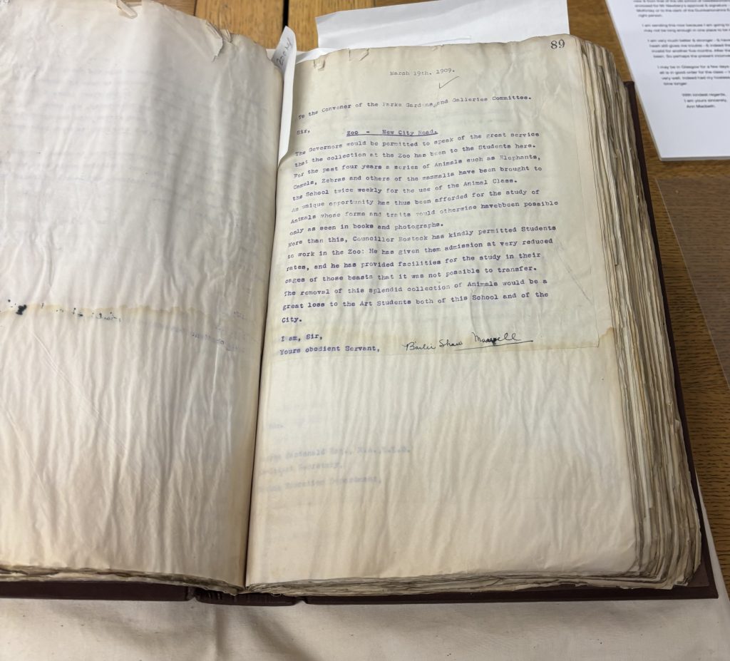 We visited the archive the following week, at the Whisky Bond, and I was impressed by the variety of artefacts I saw. I learned more about the Macintosh style, that I wasn’t particularly familiar with, as a foreign student. From what I remember, I saw the writings of some Glasgow Girls, tied to the suffragette movement, where a student in 1909 criticized the School of Art for having women as muses but not as students of the institution, by using a zoo as a metaphor. Here I was reminded of how art, even in its emancipatory nature and values, has and continues to display marginalized groups in order to fetishize them and not necessarily involve them in the debate. It was great to see how these items were preserved and the rich collection the school has, spanning several decades.